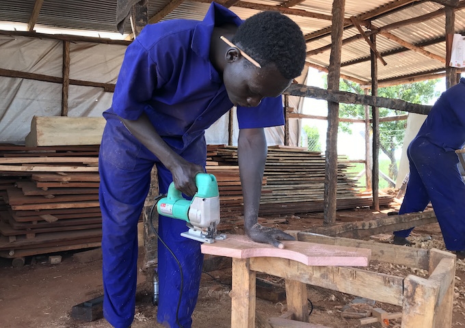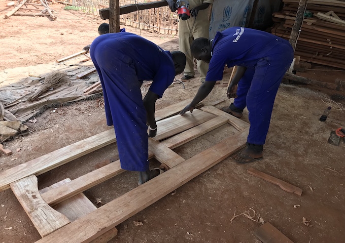 南スーダンから逃れてきた難民の方、そして難民を受け入れているウガンダの地域住民の方たちが、「木工大工」と「洋裁・服飾デザイン」の技術を学んでいます。木工大工では、約8ヶ月間の訓練の始めは、簡単なタイプの椅子やテーブルを作ることから始めました。訓練の後半に入り、木製のドアやベッドなど、難しい家具にも挑戦しながら技術を学んでいます。
