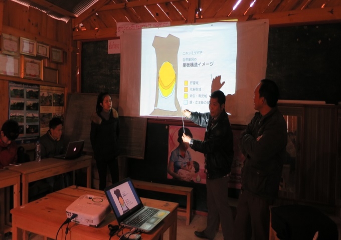 村の集会場にプロジェクターを設置し、日本での研修の様子を映し出しました。村の人たちにとっては、おそらく初めて見る日本の風景や重箱式巣箱の構造や機能、採蜜する現場など。一枚一枚のスライドに興味深く見入っている様子です。日本に渡航したメンバーが、時折、冗談を交えながら、日本で学んだ養蜂の技術や手法を伝えていきました。