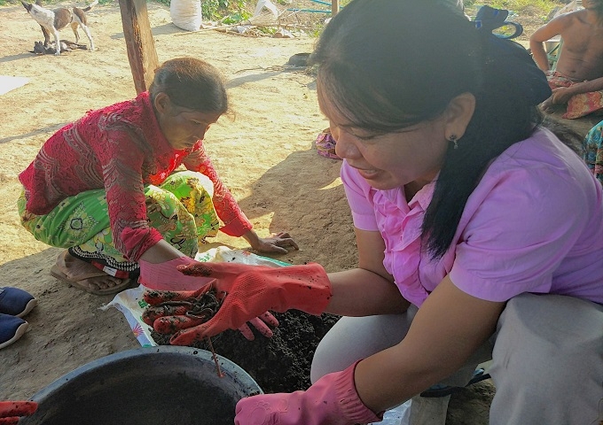 【現地スタッフのラウとイェト(右手前)からミミズの養殖訓練を受けるソックーンさん(左奥)】