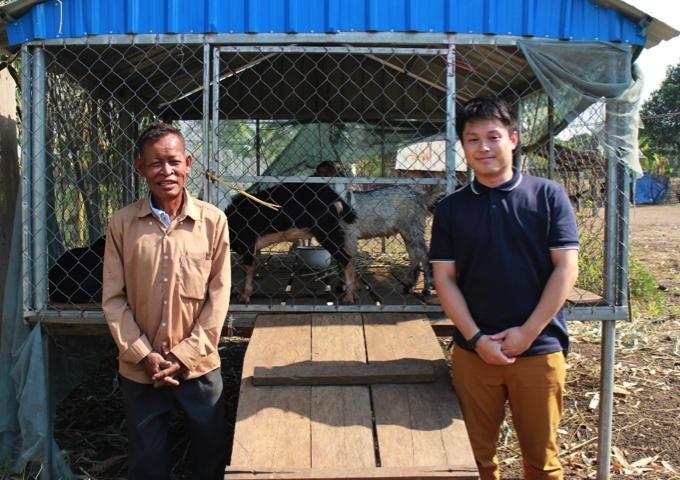 【ヤギ小屋の前で写るペッチ・サルンさんと今回訪問した栗田職員】