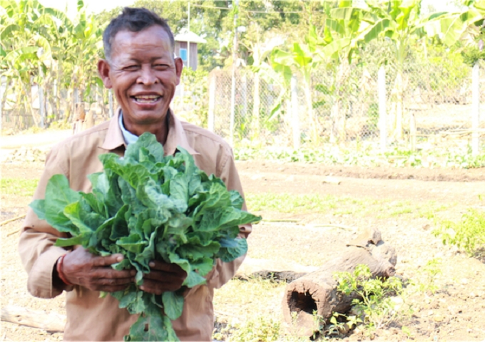 ペッチ・サルンさんの家でまず驚いたのは、家の前で栽培された野菜です。葉物野菜などを栽培して、自分で食べるのはもちろん、近所の人たちが毎日買いに来てくれるそうです。その収入は、1日平均3ドル。この日も畝に綺麗に育ったケールを収穫してきてくれました。日雇い労働で1日5−6ドルぐらいの収入を考えると、支出を減らした上で収入が3ドルあるのは、悪くありません。