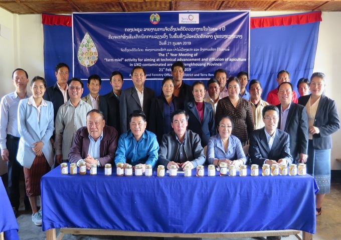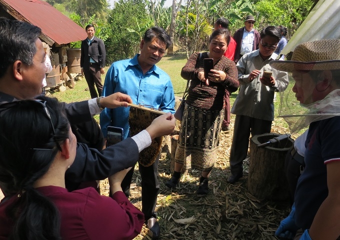 2017年10月から始まった養蜂支援事業。少し遅れてしまいましたが、1年目の事業成果報告会をポンカム村で開催することができました。ポンカム村の村長や村人はもちろん、同じく養蜂事業を行っているムアン村の人たち、そしてペック郡の事務所長、農業局長や外務局の職員、遠方のビエンチャンからは外務省の職員まで、多くの関係者たちが参加しての報告会となりました。