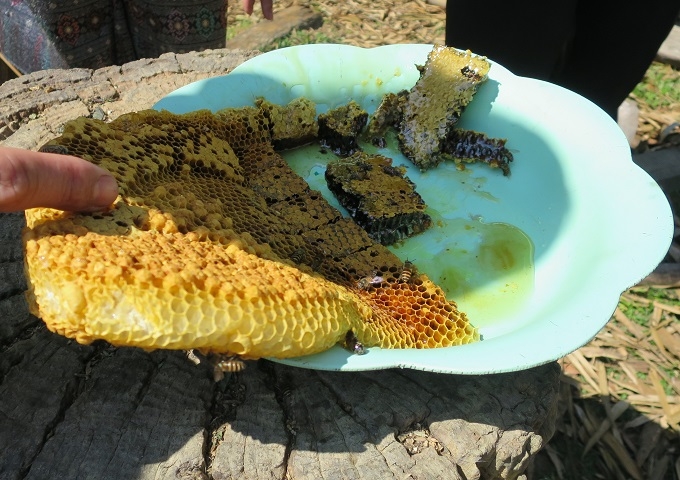 報告会の後半には、ポンカム村の村人の家庭を訪問し、実際の養蜂事業現場の見学を行いました。最初は恐る恐る巣箱に近づき様子を伺う参加者たちでしたが、巣箱から採取された蜜ろうの美しさや採れたての蜂蜜の美味しさを堪能し、養蜂の魅力を実感している様子でした。