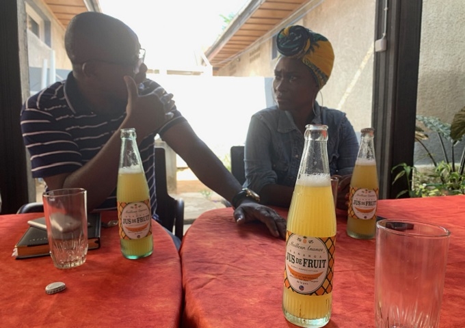 【カナンガ市内のホテルのバーに並べられたパイナップルジュース(真ん中)】