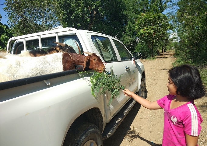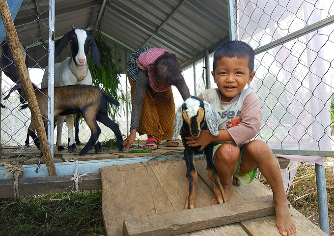【一度に3頭の子ヤギが生まれたペッチ・サルンさんの家族では、子どもたちが子ヤギの世話をする】