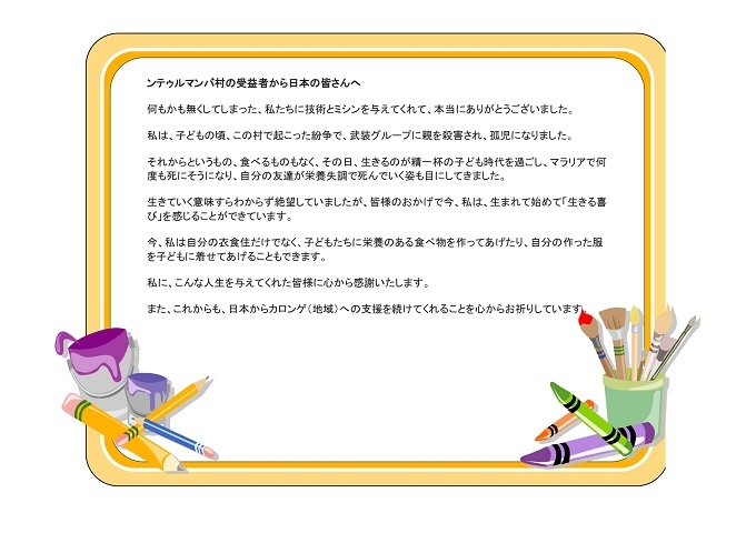 先日、コンゴ民主共和国のンテゥルマンバ村の洋裁店で働く女性たちから上記のメッセージをいただきました。この村では、昔、武装グループ(FDLR)が襲撃し、53名が一夜にして虐殺されました。その時の虐殺で、親を殺された女の子たちが、今、ここでビジネスを始めている受益者たちです。