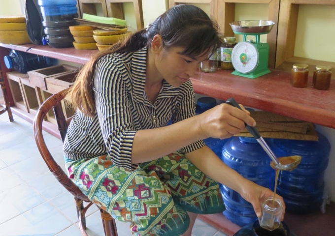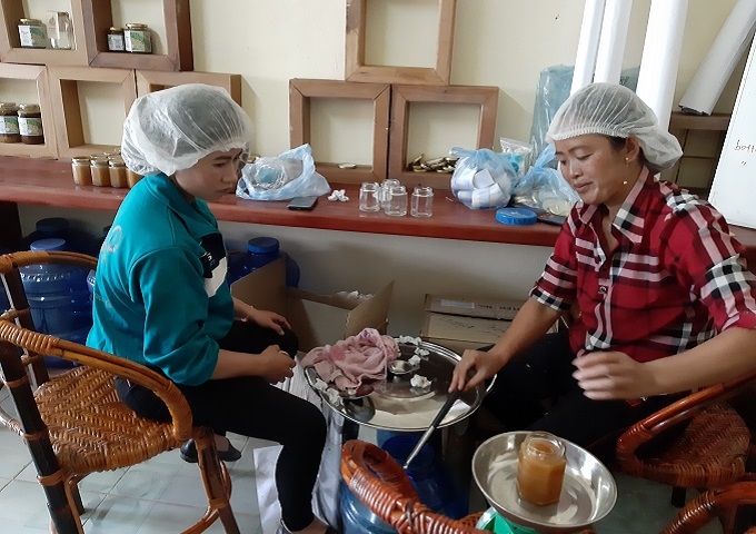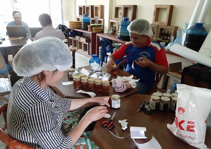 2人で協力して、ムアン村からのはちみつのパッケージングを終えました。