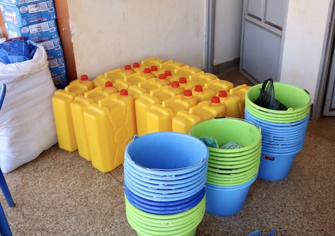 【配布したポリタンク、バケツ、洗剤】