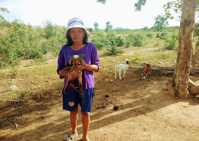 ロカブッス村に住むチョウク・ケーンさんは、ヤギ銀行からのヤギの貸し出しを受け、ヤギの飼育をしています。すでに貸し出された3頭のヤギを返却し、また3頭の子ヤギが生まれてきました。