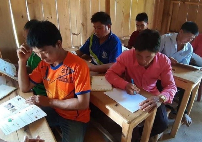 【渡した養蜂マニュアルを熱心に見るムアン村の村人たち】