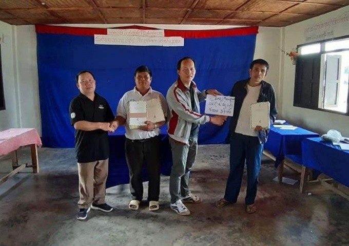 【養蜂マニュアルをポンカム村の養蜂グループの代表に渡す現地スタッフと養蜂専門家】
