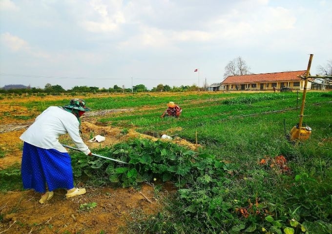 すでにため池を掘って雨季に水が溜まっていましたが、皆様からご支援でため池から水を汲み上げるポンプやタンクを建設することができ、配水システムを4世帯の村人たちと作ることができました。そして、2020年1月から土地を分配し、野菜栽培を始めることができました。空芯菜や葉物野菜の栽培から始め、2月から収穫し、販売を始めています。