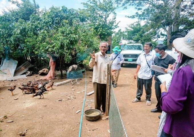 写真:家を訪問したバッタンバン農林水産局の職員に鶏飼育の説明をするソーンさん