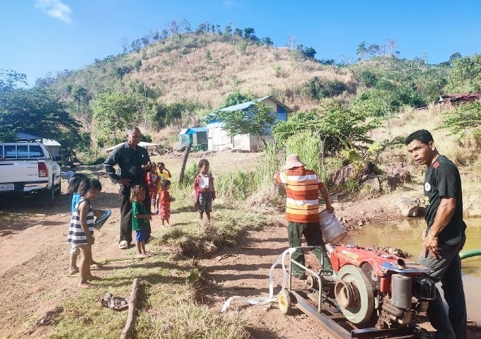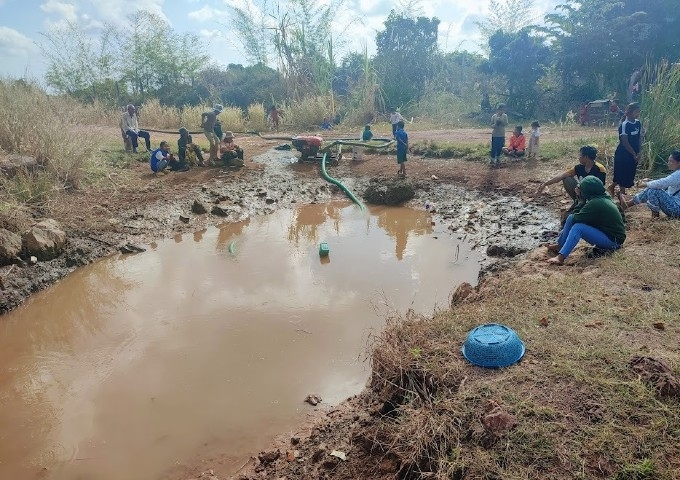 そこで、乾季である2月を待って、どれぐらいの水が湧き出ているのかを確認することにしました。ポンプで水を組み上げ、別のもう1つのため池へ水を移します。