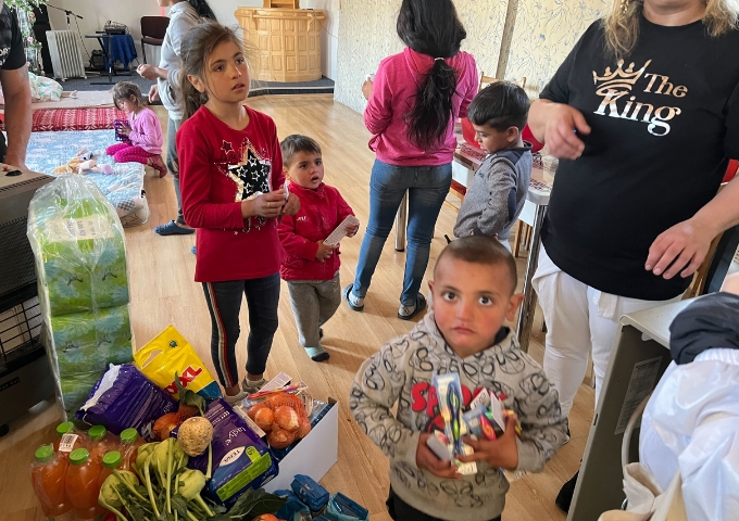 ある小さな教会にいる、少数民族「ロマ」の難民に、食料や燃料を調達・支援を行なった。子ども9人と母親2人が行くあてがなく国境の駅にいたところを、教会が助け、一時的にかくまっている状態。教会の人もロマの方々と思われ、生活に余裕がありそうではなかった。