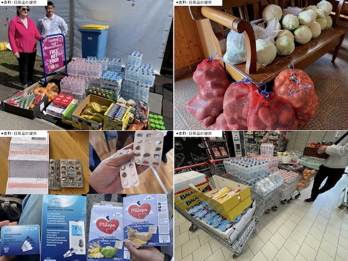 食材(肉、野菜、果物、調味料、食用油、小麦粉など)日用品(洗剤、シャンプー、歯ブラシ、生理用品、衛生用品、トイレットペーパー)薬などの提供。