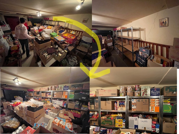 また、ウクライナ側のパートナー団体は、実質ほぼ二人の神父さんがボランティアで活動しており、物資の整理をしたり、倉庫を適切に管理したりする余裕がありません。そこで、整理整頓のための棚を設置し、倉庫管理を改善しました。それにより、物資をスムーズに搬入・搬出できるようになっています。