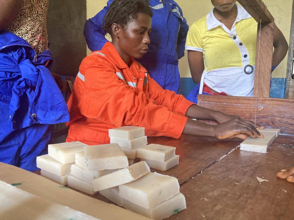 中央カサイ州のコミュニティ施設で実施している二つ目の活動が、地元のアブラヤシから抽出したパーム油を原料とする石鹸作りの訓練です。