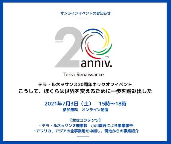 今回の7月3日(土)に開催するオンラインイベントは、その20周年を迎える本年度のキックオフとして、理事長小川真吾による「20年で培ったテラ・ルネッサンスらしい支援の在り方」、国内外の各事務所を中継でつなぐ「テラ・ルネッサンス号に乗って」の2部構成3時間のイベントで、テラ・ルネッサンスの20年、そして今が分かる内容です。